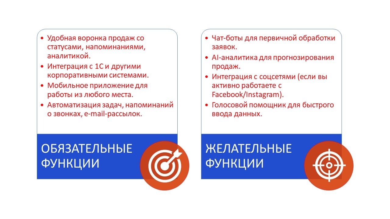Подготовить список нужно для того, чтобы не переплачивать за ненужные функции и не упустить важные. Составьте два перечня: обязательные функции и желательные, но не критичные.