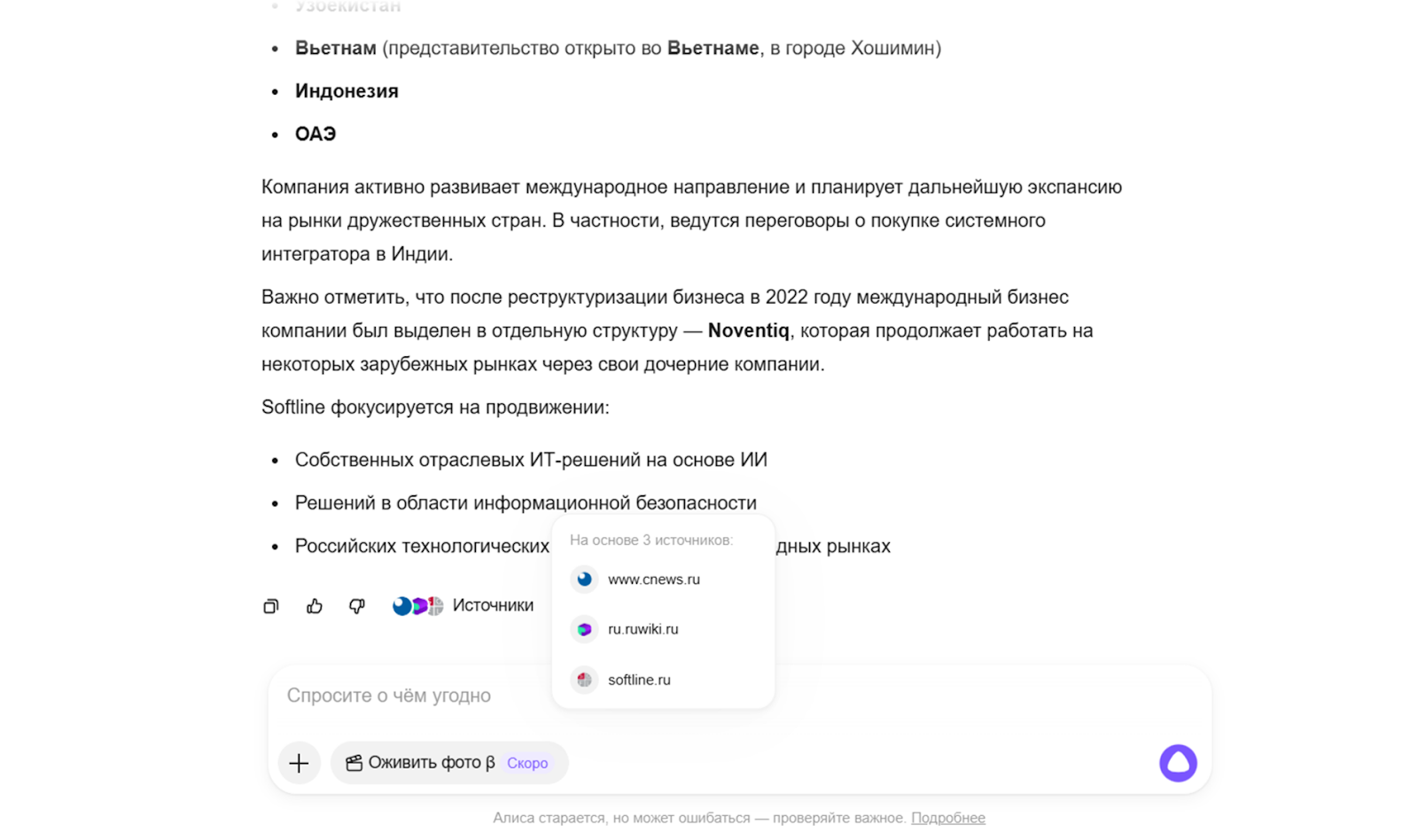 Кроме DeepSeek и Qwen, все нейросети справились с задачей без грубых ошибок. Можно выделить YandexGPT за то, что дополняет информацию из интернета (главное — это видно в ответе, так как указаны источники), а Le Chat за подсказки с дополнительными вопросами.