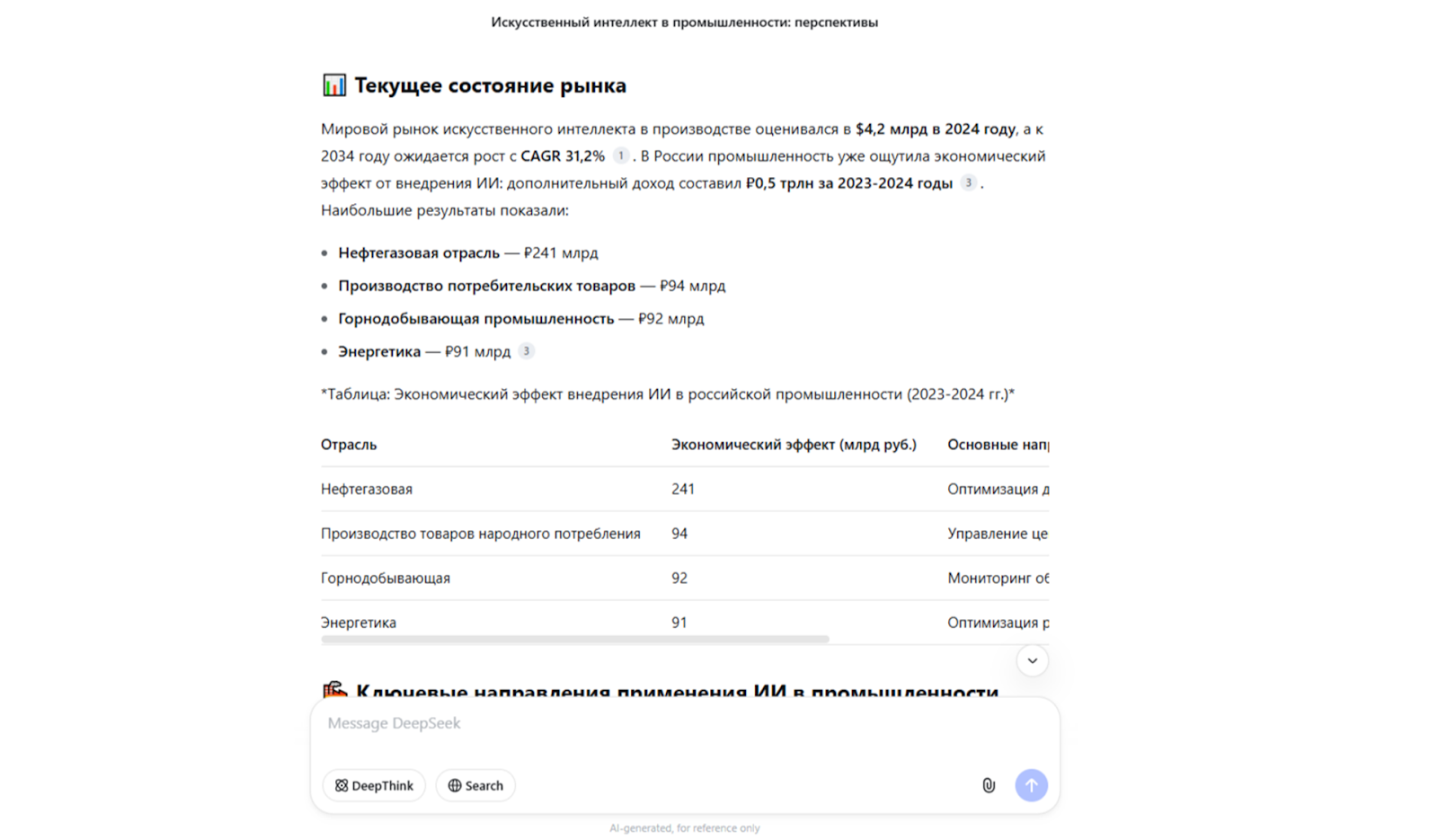 Ответ DeepSeek соответствует формату статьи. У материала четкая разветвленная структура из 8 основных разделов. Нейросеть составила две таблицы: про основные препятствия для внедрения ИИ в промышленности и экономический эффект для разных отраслей. DeepSeek неплохо поработал с поиском в интернете, есть ссылки на информацию за 2024 и 2025 годы. Однако не все используемые источники информации можно назвать качественными. При этом большая часть ответа опирается на одну статью.