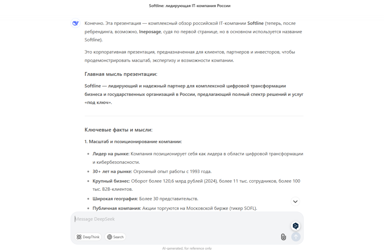 При анализе презентации нейросеть «придумала» факт: в компании произошел ребрендинг и смена наименования на Ineposage. Также допустила ошибки в написании некоторых продуктов и компаний ГК. Основные факты DeepSeek передал корректно, правильно ответил на вопросы, но был более настойчив в своих вероятностных оценках. Предложил обратиться к представителю компании и указал контакты из презентации.