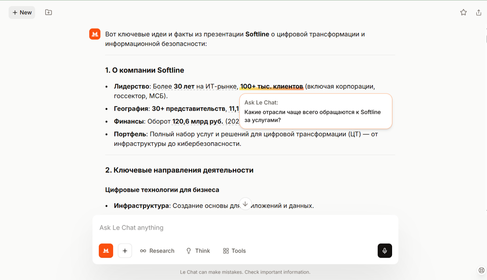 Le Chat составил подробное резюме из презентации, основную информацию передал, но допустил небольшие ошибки в наименованиях продуктов. На вопросы по содержанию ответил корректно, ничего не придумывал. Стоит упомянуть, что нейросеть сама предлагает дополнительные вопросы исходя из контекста.