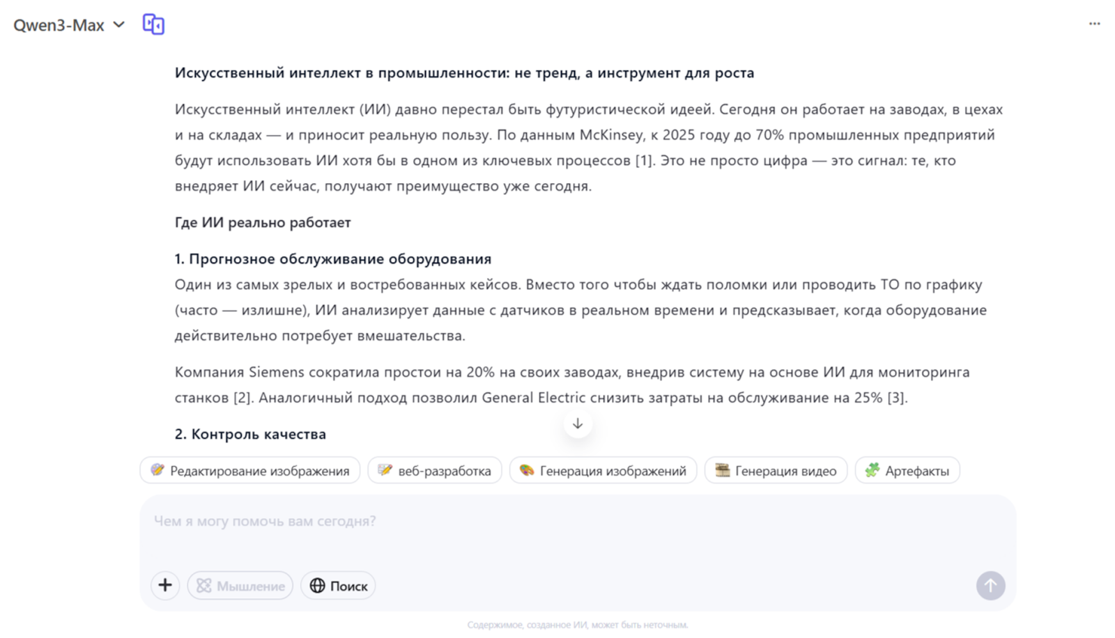 Для чистоты эксперимента протестировали несколько версий в разных режимах. Лучше всего с задачей справился Qwen3-Max. Результат по структуре и фактуре похож на статью, есть примеры и выводы. Однако во всех версиях 90% указанных источников не существуют или ссылки не ведут на актуальный материал. При этом есть очень глупые ошибки. Например, приводится кейс из Курской области со ссылкой на отчет McKinsey. С точки зрения стилистики у текста все признаки авторства нейросети.