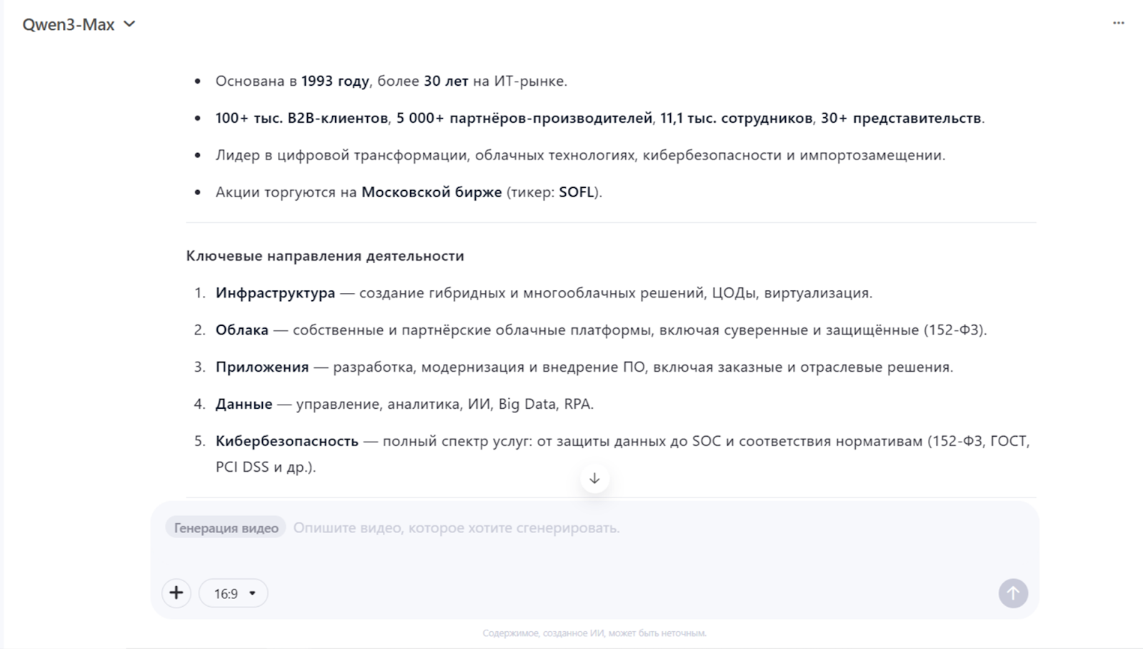 С анализом презентации Qwen справилась неплохо. Корректно ответила на все вопросы, правильно структурировала информацию. Ошибок в наименованиях не допустила, но была небольшая путаница с описанием собственных продуктов компании.