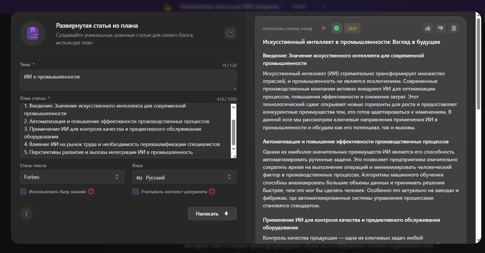 Создание контента. Попросим нейросети написать текст для блога ИТ-компании на тему «Применение ИИ в промышленности». Здесь оценим умение структурировать информацию, поддерживать деловой стиль и генерировать полезные идеи.