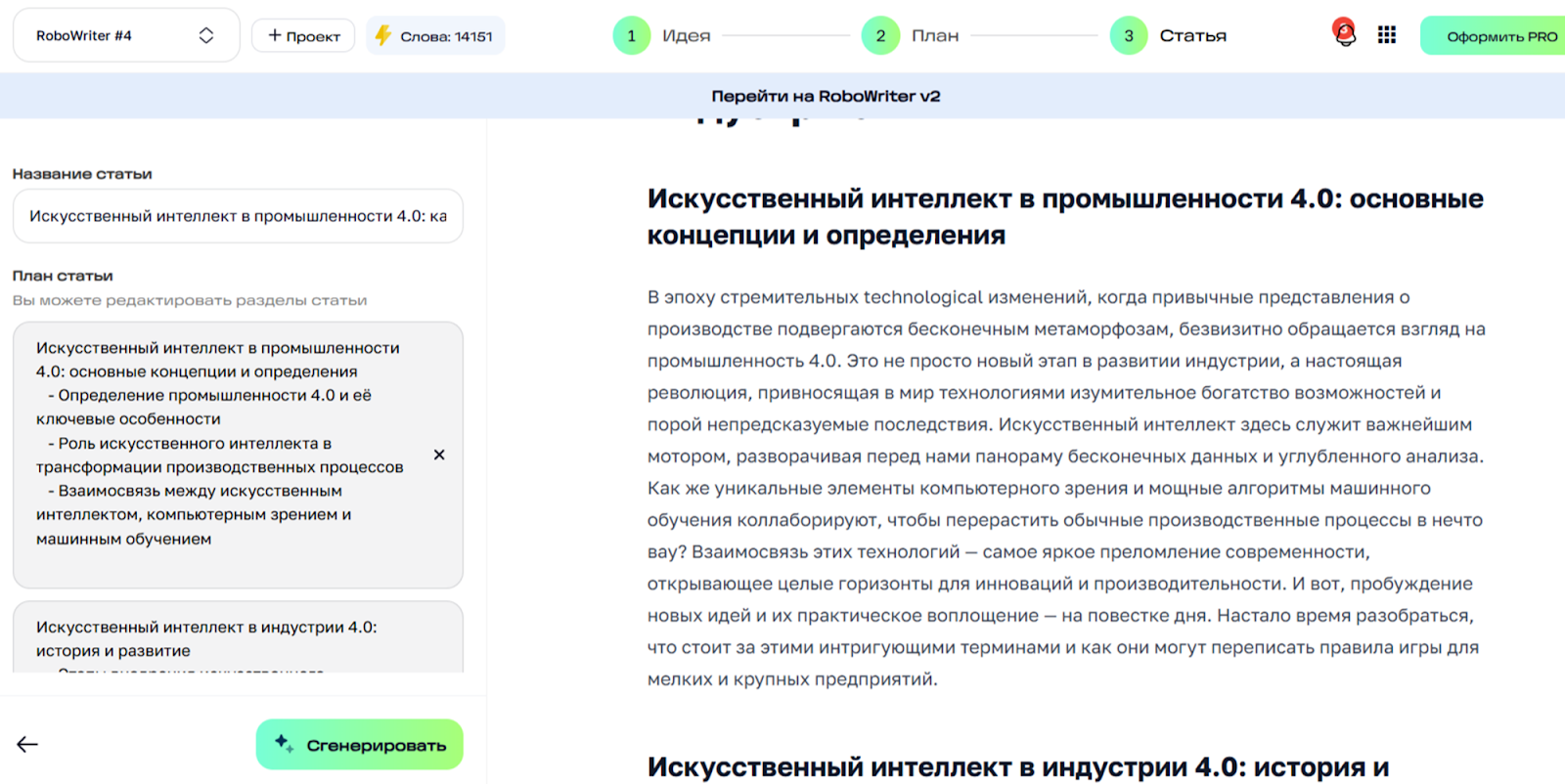 Robowriter сгенерировал хороший план статьи — со множеством разделов и подтемами. План можно отредактировать самостоятельно и затем запустить генерацию. Robowriter написал объемный текст на несколько тысяч слов. Сервис использовал немного статистики, но в основном в статье нет конкретики, примеров, только общие слова и рассуждения. С точки зрения языка ситуация еще хуже. Предложения обрываются, проскакивают английские слова, используются избыточные обороты, есть ошибки в согласовании слов.