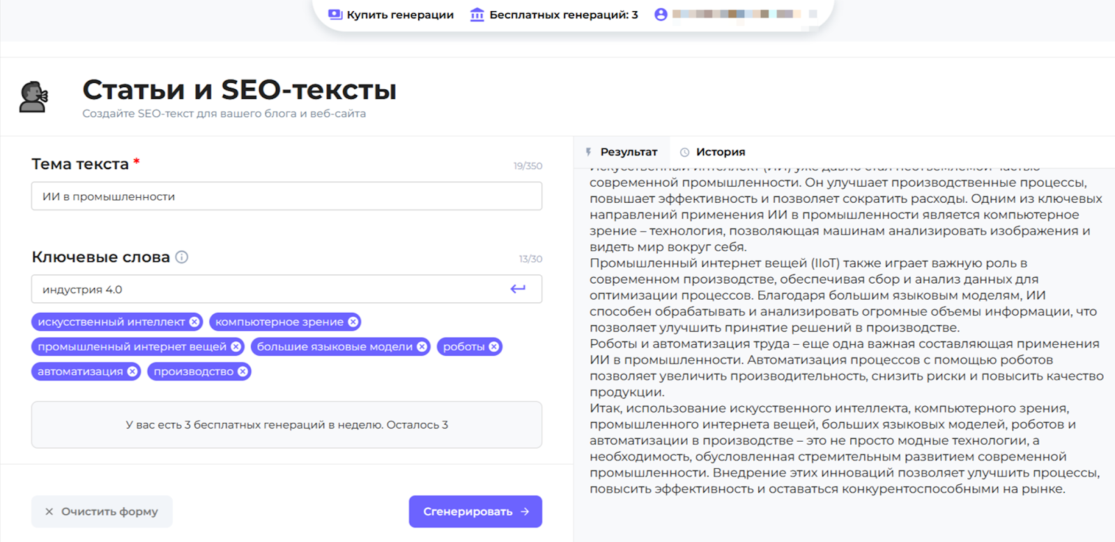 Мы попробовали написать статью с помощью шаблона для seo-текстов. Сначала нужно обозначить тему материала, затем загрузить ключевые слова. Это и есть все параметры для настройки. На выходе получился короткий текст, который никак не напоминает статью, больше похож на пост для социальных сетей. В тексте много воды, нет фактов и логических выводов.