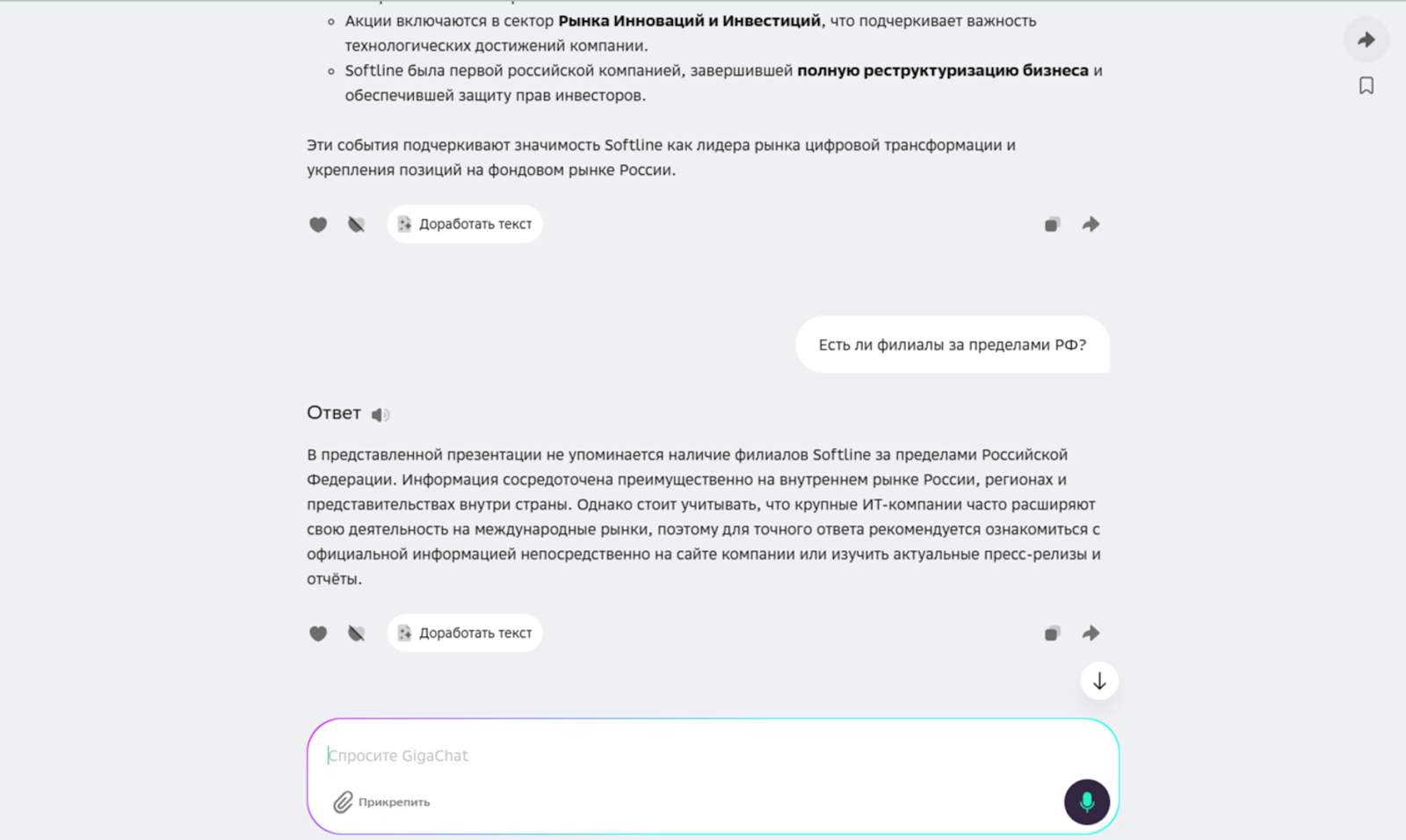 Чтобы проверить, насколько эффективно GigaChat работает с загруженными файлами, предложили ему проанализировать презентацию о ГК Softline и ответить на вопросы по содержанию. В целом нейросеть справилась с задачей, выделила основные мысли без ошибок. Ответы на уточняющие вопросы были немного обобщенными и не содержали конкретики. Если запрашиваемых сведений не было в презентации, нейросеть об этом предупреждала и предполагала, какой мог бы быть ответ исходя из общей информации о компании.