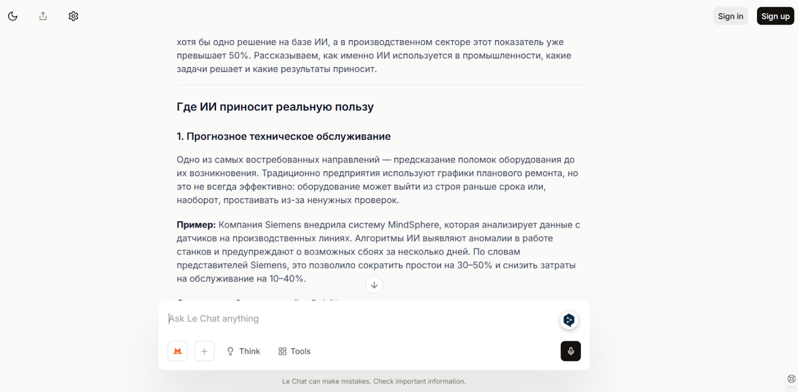 Ответ нейросети по структуре похож на статью — есть несколько разделов, конкретные примеры, таблица, статистика. Le Chat ссылается на авторитетные источники, но при переходе по ссылкам этих материалов не обнаруживается. Текст написан просто, встречаются перегруженные конструкции, но не часто. Нейросеть написала осмысленный вывод и даже уместно использовала метафору, что ИИ — это не волшебная палочка (хотя эту метафору любят все нейросети, это уже становится их штампом).