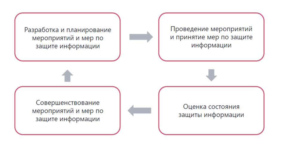 Приказ закрепляет процессный подход к защите информации. В чем он заключается? Процесс защиты — это замкнутый цикл, который повторяется на протяжении всего времени существования информационной системы. Вот как он выглядит на практике.